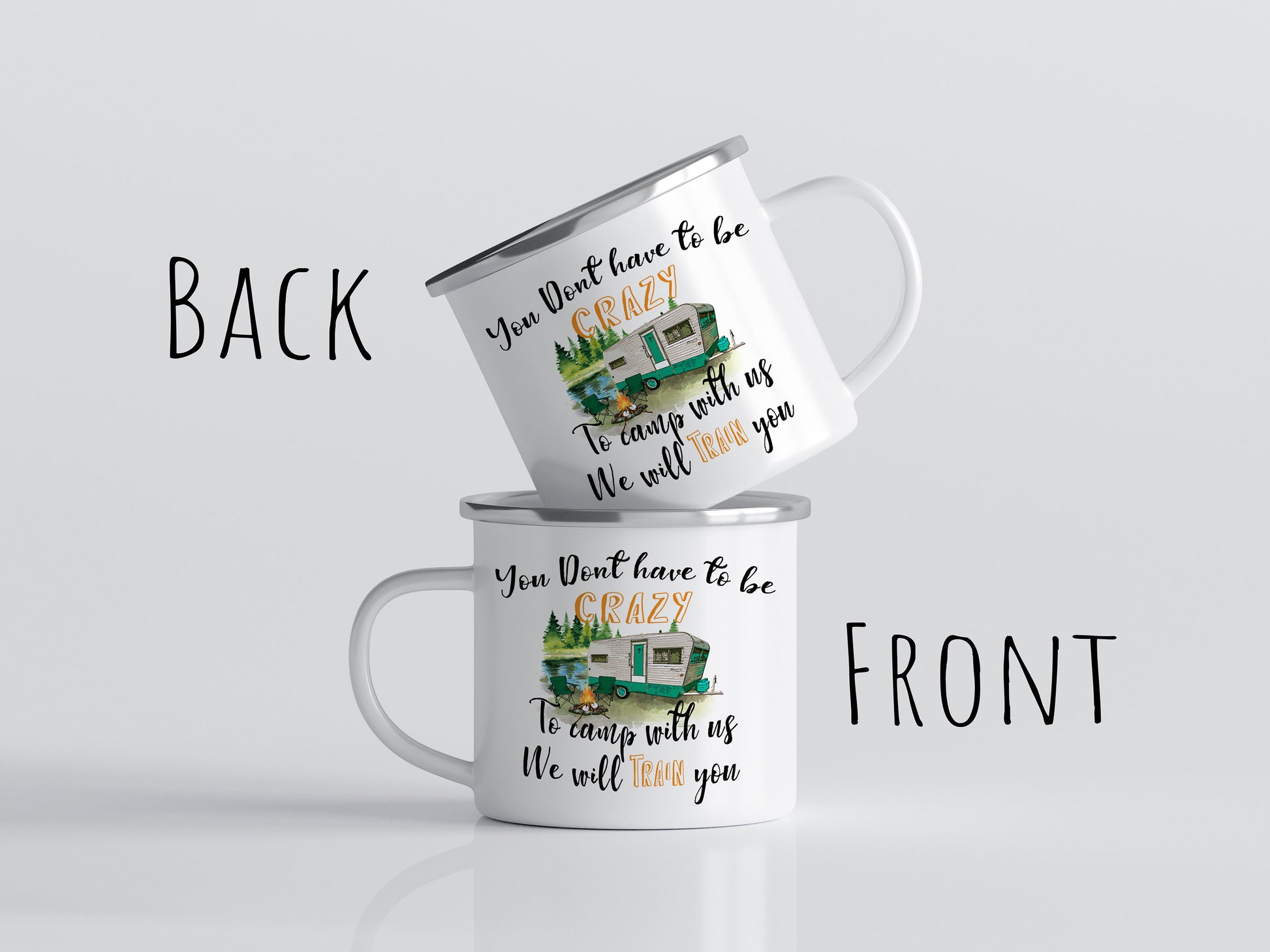 Glamping Camping mug. Printed with vibrant colors on your choice of the Silver rim or Black rim enamel mug. Great gift or party favor. Make gifts for a special family camping event or for yourself or a loved one that will be treasured for a lifetime, guaranteed that the design will never fade or peel. The design will be printed on both sides, unless otherwise requested.