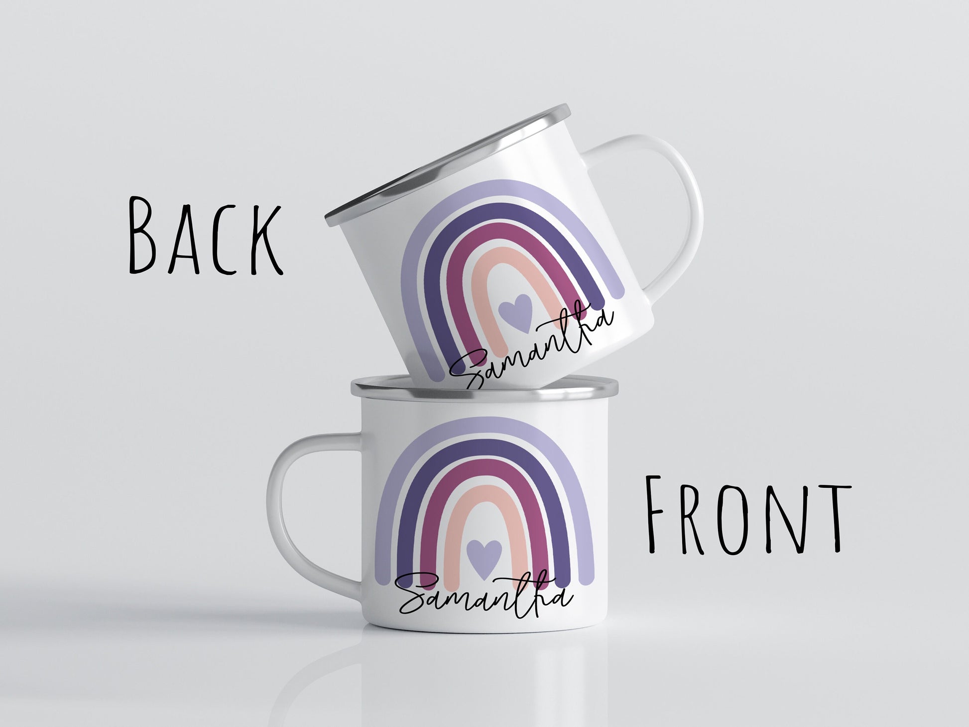 12oz/18oz Personalized Rainbow Camp mug, Custom Purple Enamel Mug, Children's Name Mug, Custom Kids Mug, Kid's Party favor gift ideas