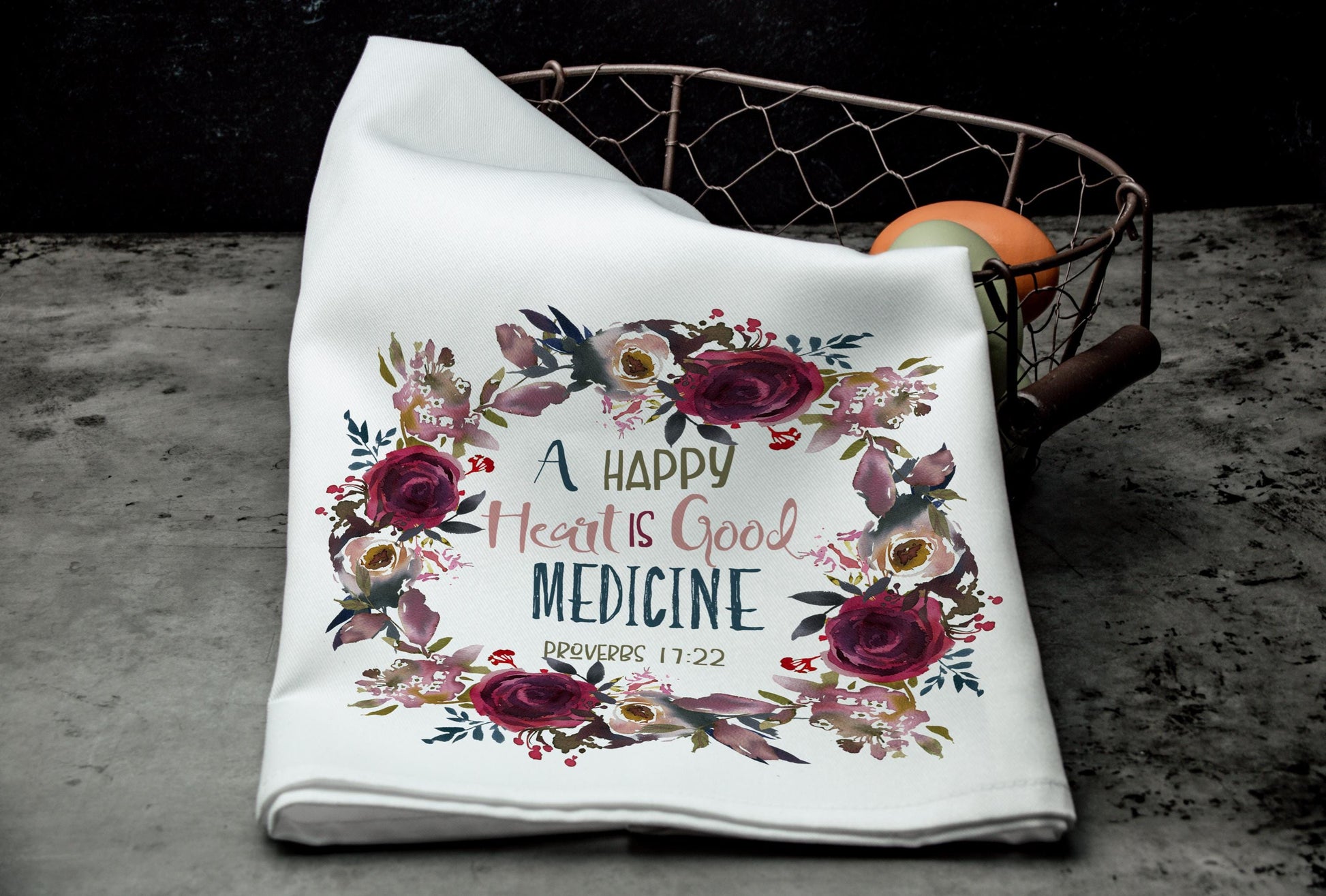 Inspirational Bible Verse Tea Towel, A Happy Heart is Good Medicine Kitchen Towel, Faith Tea Towels for Christians, Hand Towel, Gift for her