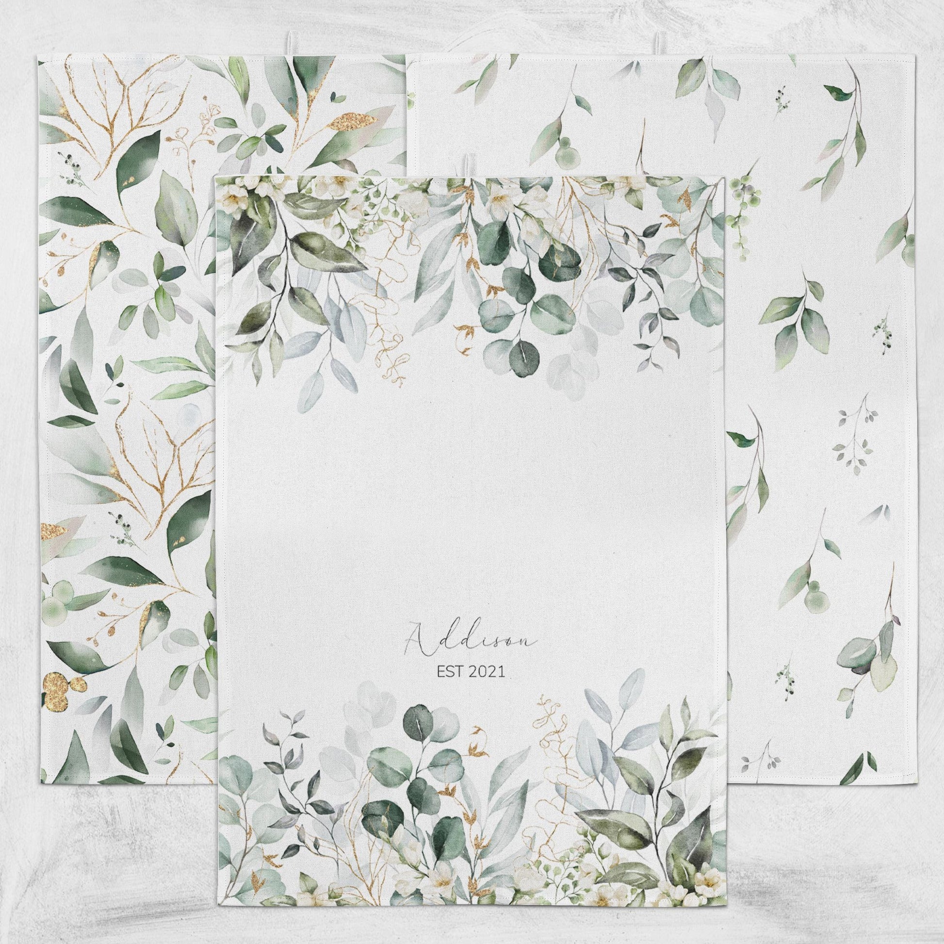 Personalized Botanical Tea Towel Set: Custom Name & Year, Greenery Kitchen Decor